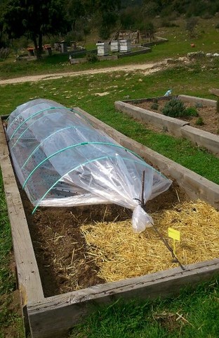 Los contenedores en los que teníamos sembrados pimientos, calabacines y caléndulas, les hicimos un hueco debajo del nuevo emplazamiento del invernadero. Al terreno que ocupaba éste y que ahora está libre, le hemos incorporado una capa de abono y lo hemos volteado. Lo estamos preparando para plantar en él los calabacines.