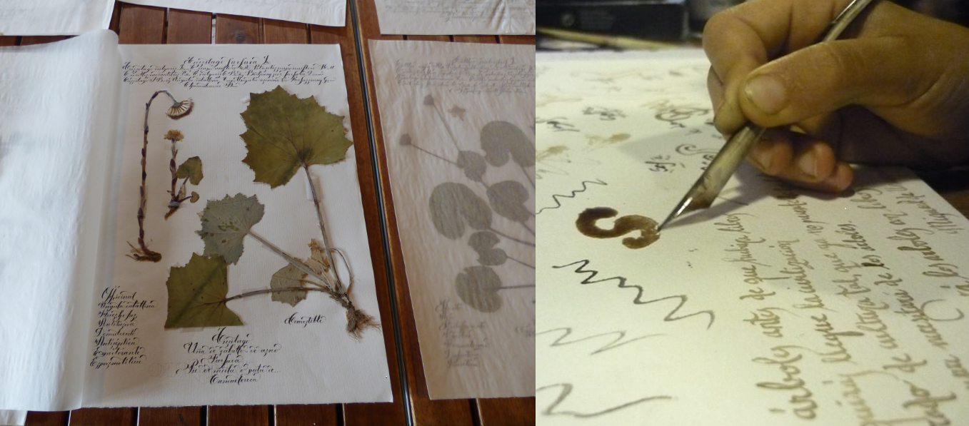 Al día siguiente, Ana y Augusto nos enseñaron cómo elaborar tintas con pigmentos naturales como las que ellos utilizan para la elaboración de las láminas de su impresionante herbario, de las cuales hasta escriben los textos con plumas de ave que ellos mismos fabrican. Esas mismas tintas, fueron luego usadas por los asistentes para trabajar sus propias láminas, continuando con el taller de Joaquín.