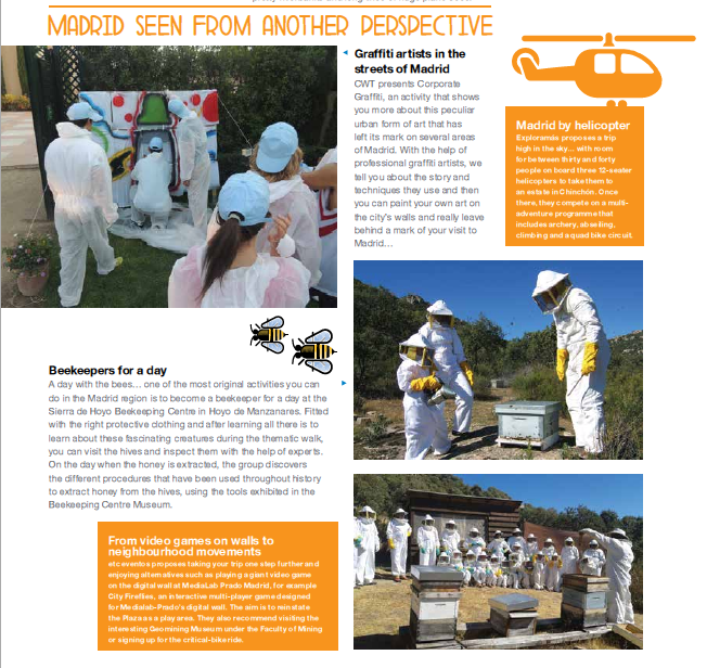 Esta pequeña reseña sobre el Aula Apícola Sierra de Hoyo, no la habíamos visto hasta hoy, y nos ha hecho ilusión. Se trata de la publicación del Madrid Convention Bureau «Unique activities for Meetings and Events», sobre propuestas de actividades originales en la Comunidad de Madrid para viajes de incentivos. Si tenéis curiosidad por ver esta publicación, puede descargarse en nuestra «Sala de Prensa»